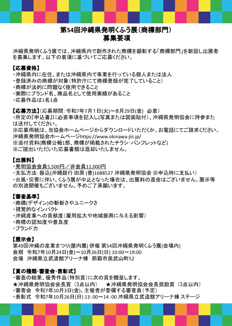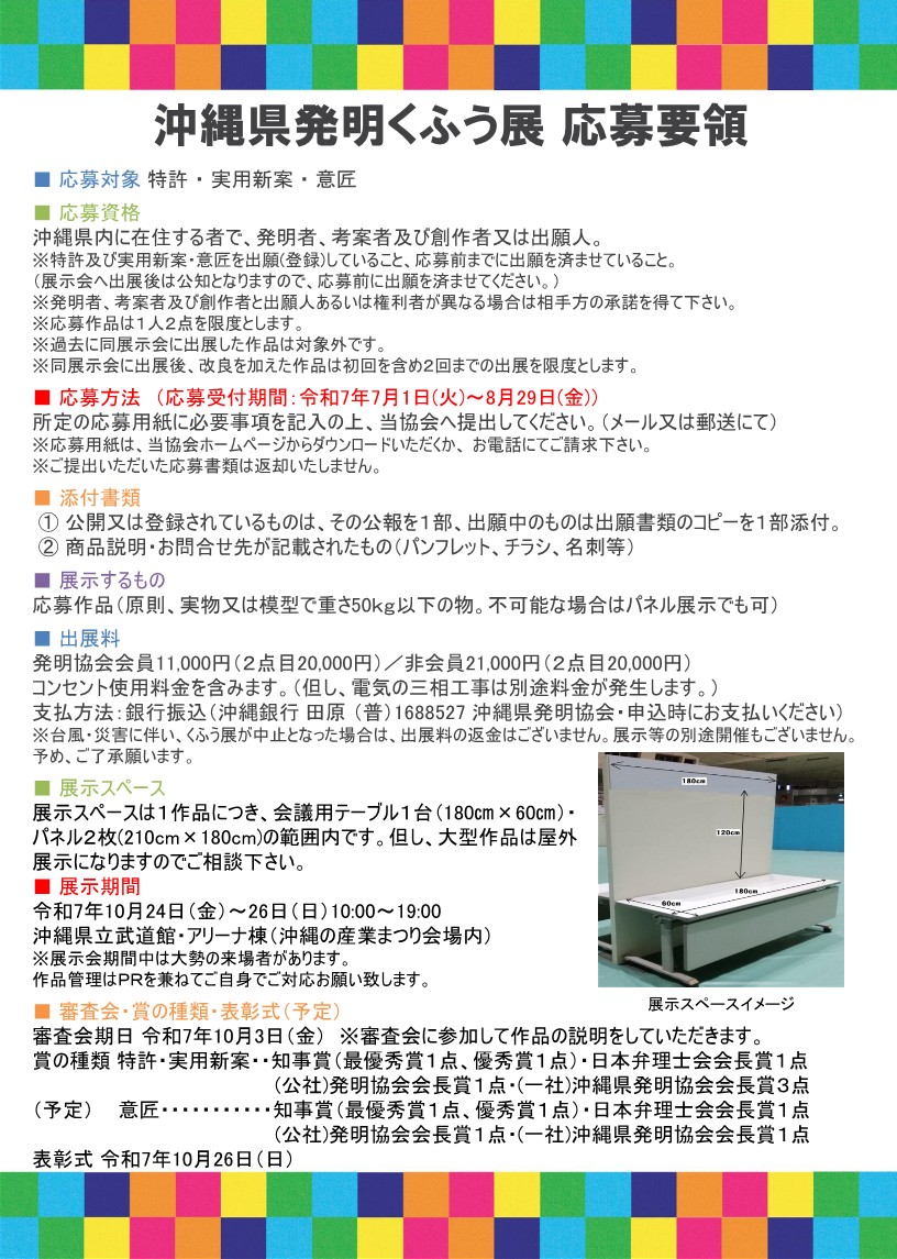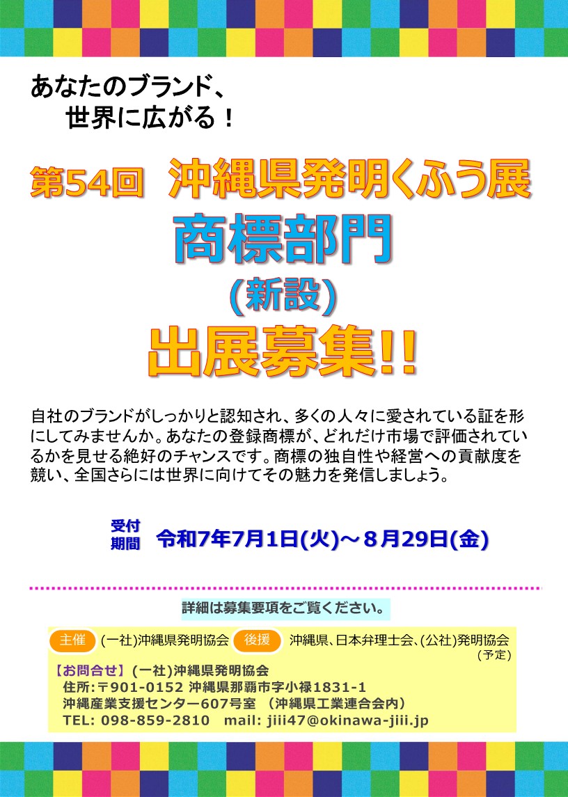 特許・実用新案・意匠・商標(新設)の出展作品を募集しています。申込書、同意書の様式は【(一社)沖縄県発明協会】ホームページからダウンロード、お電話にてご請求ください。詳細は、チラシ、ホームページをご覧くださいね。たくさんの応募お待ちしております。