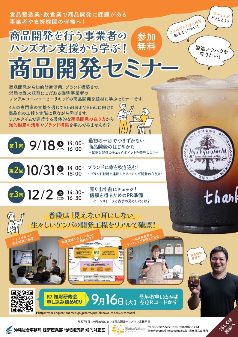 食品製造業・飲食業で商品開発に課題がある事業者の皆様、商品開発の在り方から知的財産の活用、ブランド構築を学んでみませんか?詳細は、チラシをご覧ください。たくさんのご参加、お待ちしております!